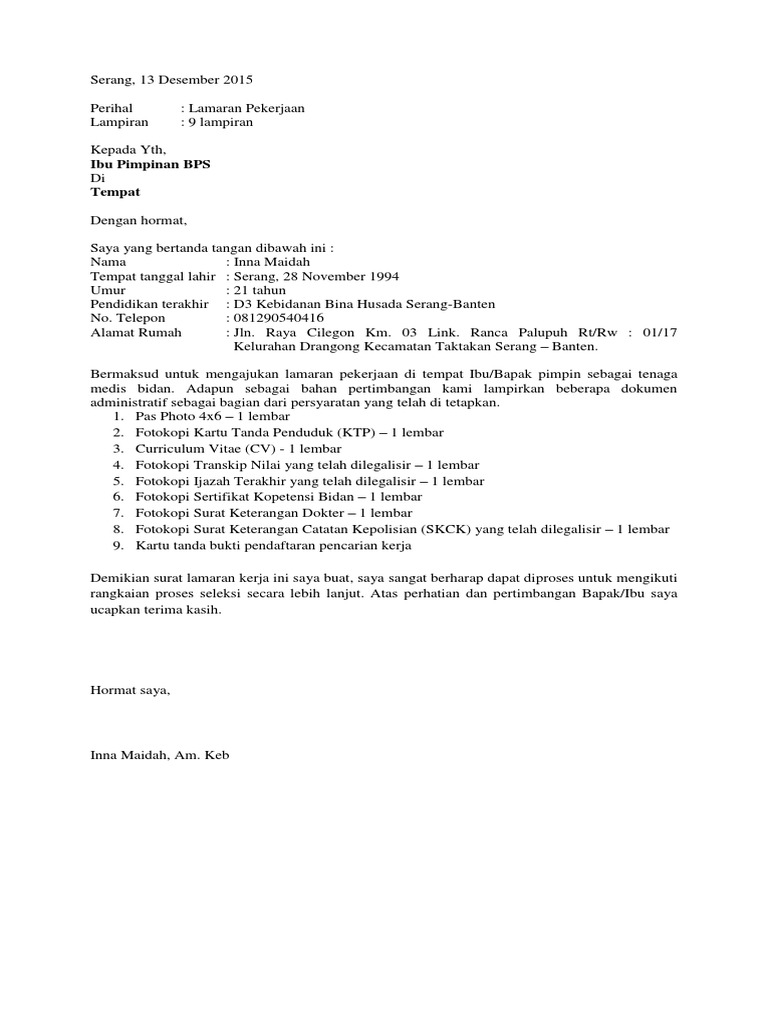 Dalam hal melamar pekerjaan, salah satu berkas administrasi yang paling dibutuhkan adalah surat lamaran kerja, diterima tidaknya seseorang pada sebuah perusahaan sangatlah tergantung dengan surat lamaran. Bermaksud untuk melamar di perusahaan yang bapak/ibu pimpin untuk menempati posisi sebagai cleaning service (ob). Yah mungkin karena teller yang selalu terlihat melayani nasabahnya. Biasanya cara seperti itu kita gunakan untuk melamar pekerjaan di bank bri cabang pembantu. Bank juga menawarkan beberapa bank membutuhkan surat dengan tulisan tangan pastikan anda mencari informasi yang benar sehingga bisa memenuhi kriteria yang dicari.